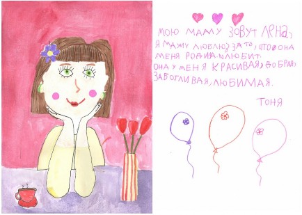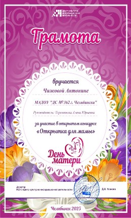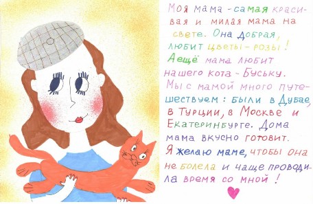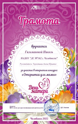 Участие в этом конкурсе стало уже традицией. В преддверии "Дня Матери", дети, под руководством Алёны Юрьевны Терентьевой рисуют открытки для своих мамочек, используя разные техники, пишут им пожелания. Лучшие работы мы отбираем для конкурса, который организует "Центр культурно-информационной деятельности" г. Челябинска. Наши участницы и их работы: