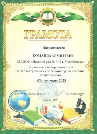 Поздравляем нашу команду "УМИЗУМИ" с успешным прохождением интеллектуальных состязаний среди старших дошкольников "Почемучки" - 2023. В этом году мы прошли во второй творческий этап и вошли в шестёрку лучших Курчатовского района! Молодцы наши воспитанники группы № 10 "Дружная семейка": Негматова Лейла, Мелёхин Михаил и Шагеев Гордей!!! Ребятам очень понравилось участвовать в этом конкурсе. Благодарим родителей за отзывчивость и поддержку!