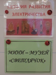 Совместно с детьми мы создали в группе мини-музей «Светлячок», где представили прошлое и настоящее развития электричества. На идею создания музея откликнулись родители, и принесли много различных экспонатов для выставки. По окончанию нашего проекта, мы с детьми посмотрели презентацию «Путешествие в прошлое лампочки» и помогли нам в этом экспонаты нашего музея.